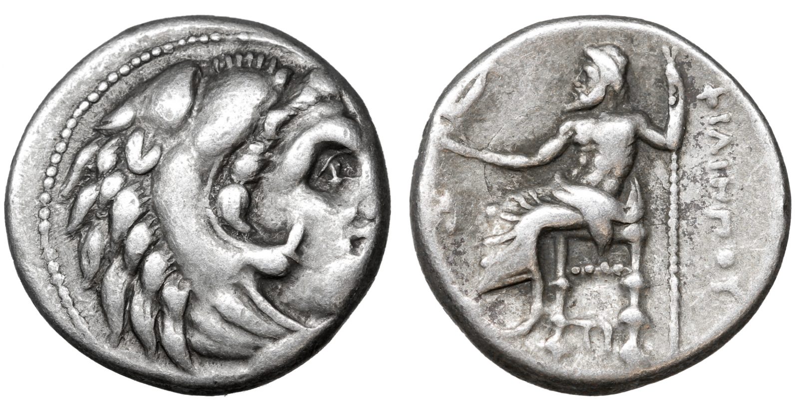 Kingdom of Macedon, Philip III Arrhidaios AR Drachm. Struck under Menander or Kleitos, in the types of Alexander III. Sardes, circa 322-319/8. 4.25 gr. – 16.4 mm. Head of Herakles to right, wearing lion skin headdress / Zeus Aëtophoros seated to left, holding sceptre; ΦIΛIΠΠΟΥ to right, torch to left; TI below throne. Price P99. aXF